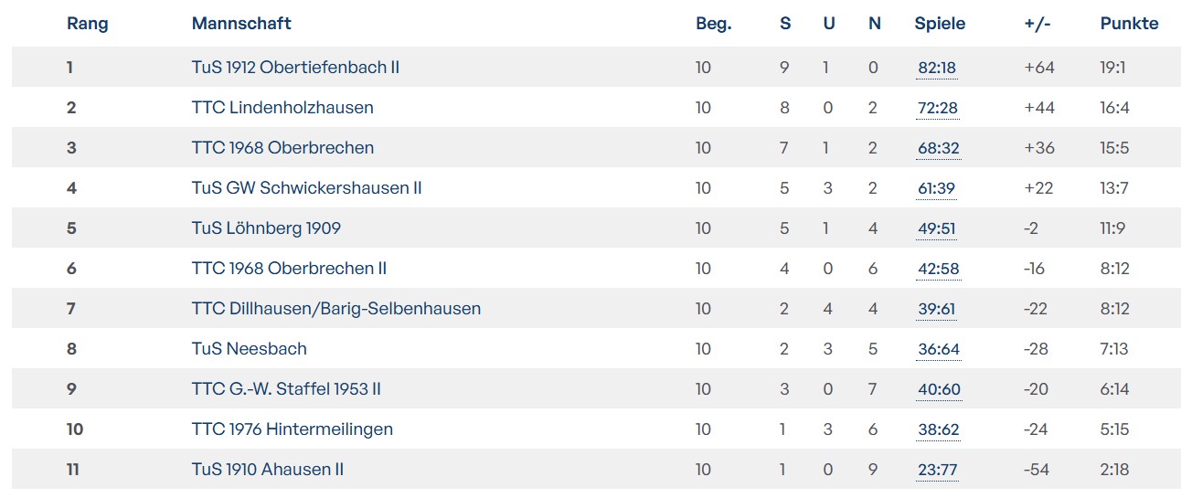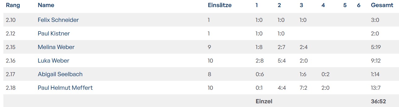 Umso erfreulicher waren die tatsächlichen Ergebnisse: Besonders die Damen I überraschten positiv. Nach der Verstärkung durch die sympathische Sally Elkaliny und dank der hervorragenden Organisation von Mannschaftsführerin Kerstin Beck, die selbst eine starke Bilanz von 9:1 Spielen erreichte, belegt das Team aktuell einen hervorragenden 3. Platz – der Klassenerhalt ist damit bereits gesichert.