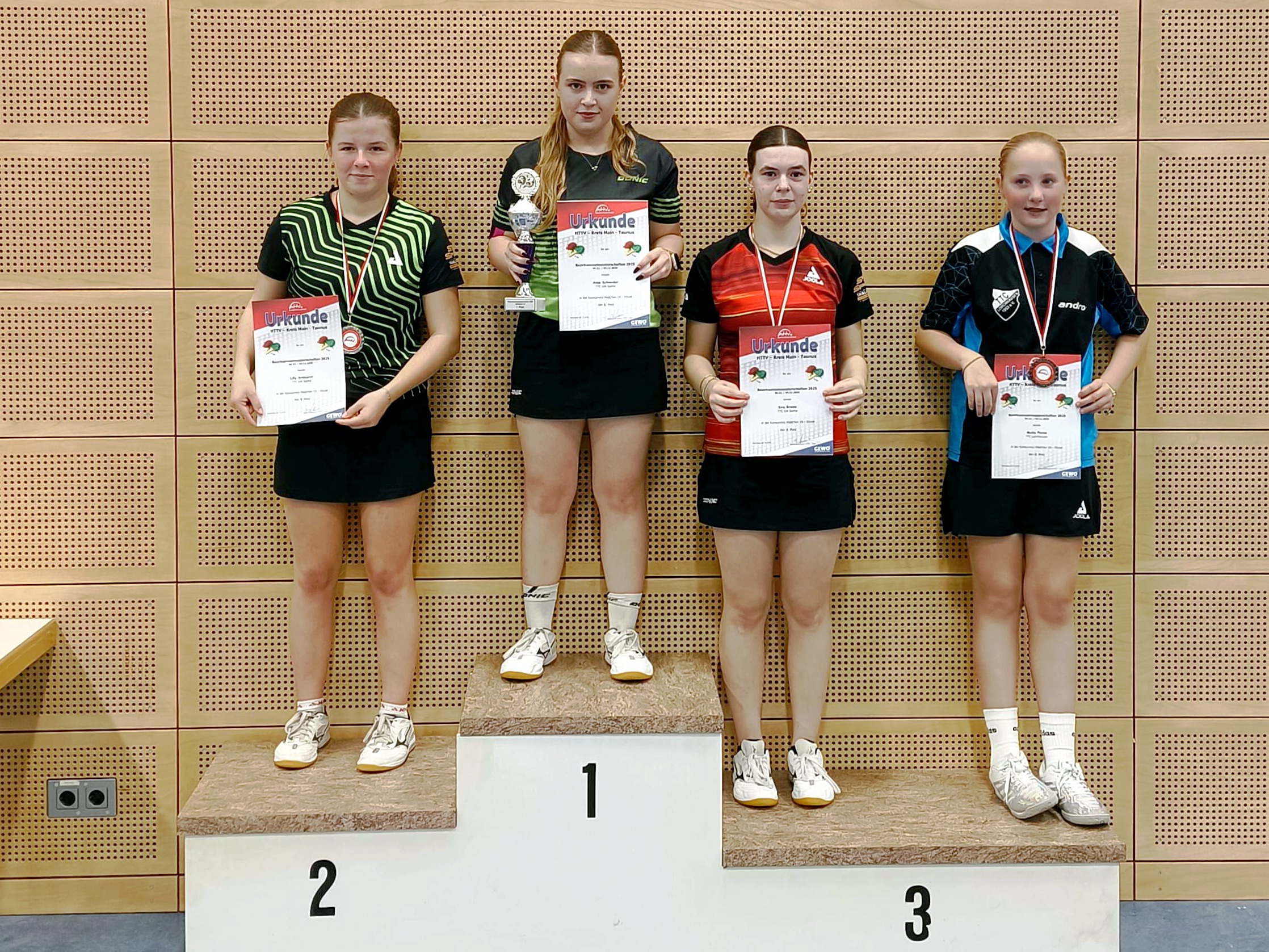 Siegerehrung Mädchen 19 mit v.l. Lilly Armborst, Anna Schneider, Kira Brahm (alle TTC Staffel) und Maike Platen (Lorchhausen)